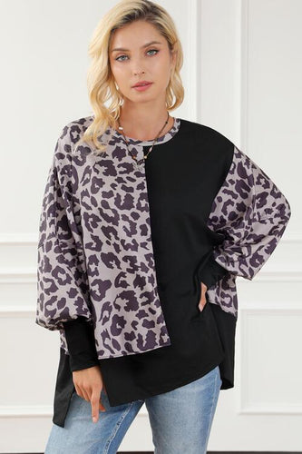 Leopard Round Neck Lantern Sleeve Slit Sweatshirt