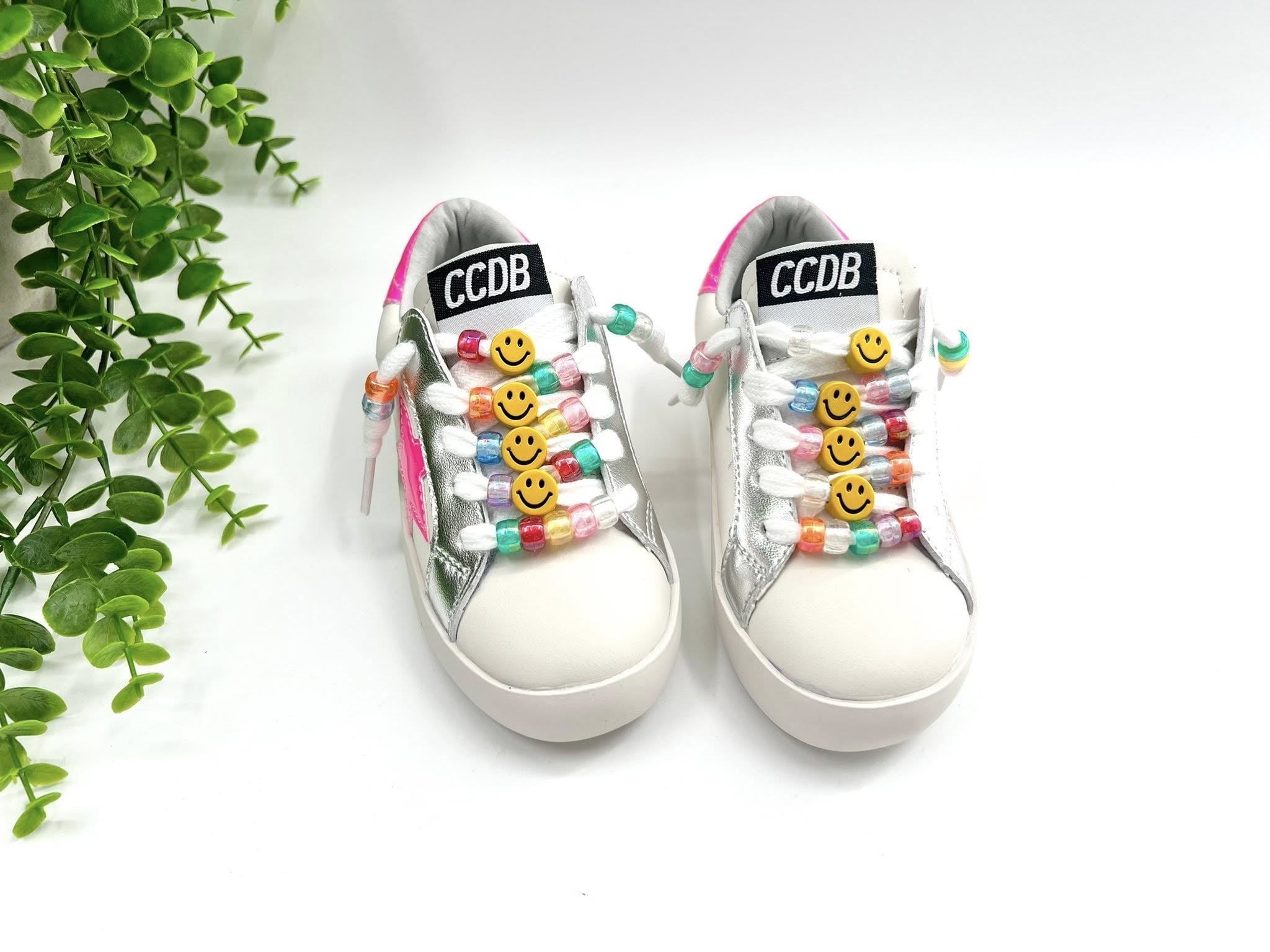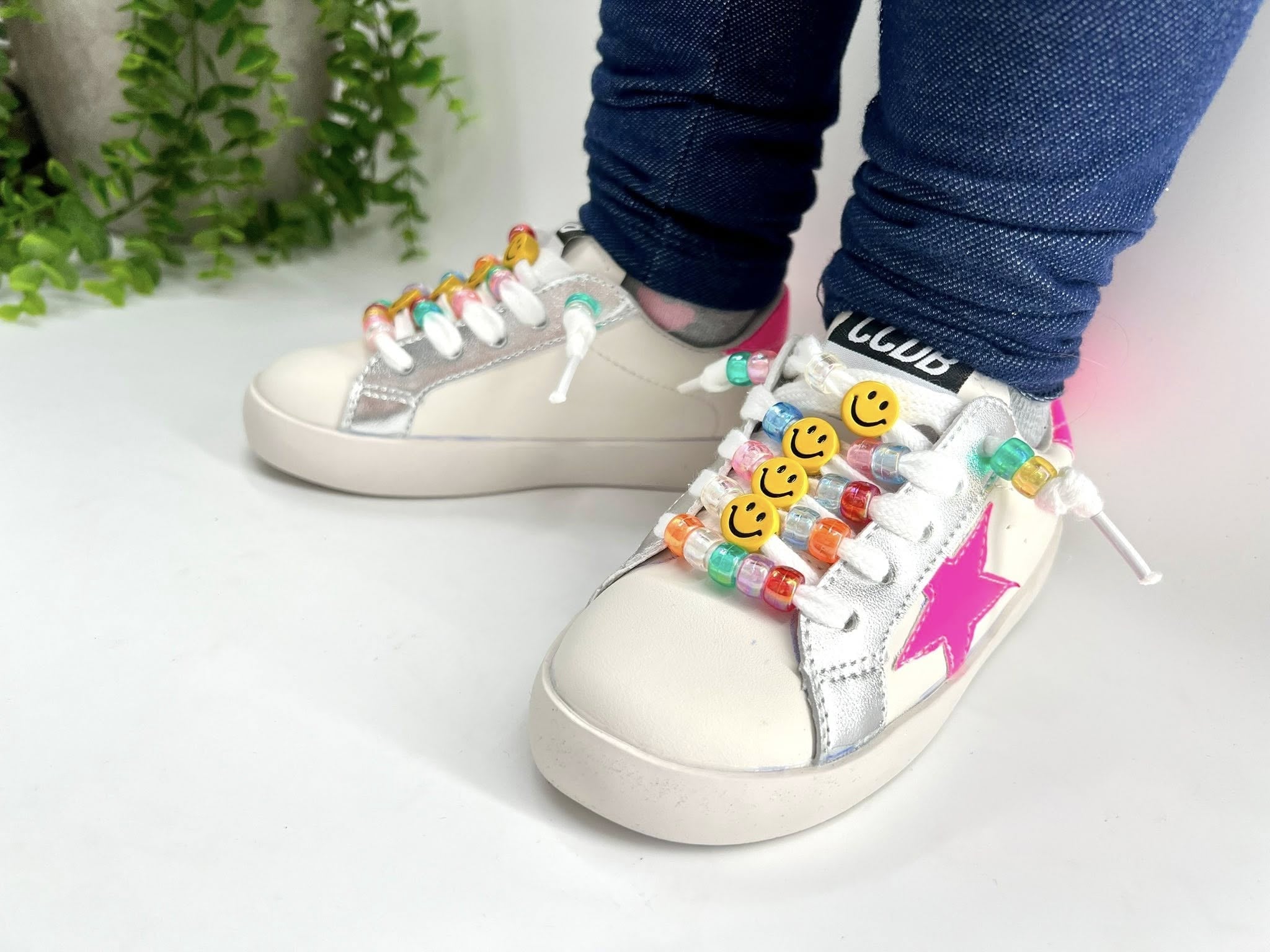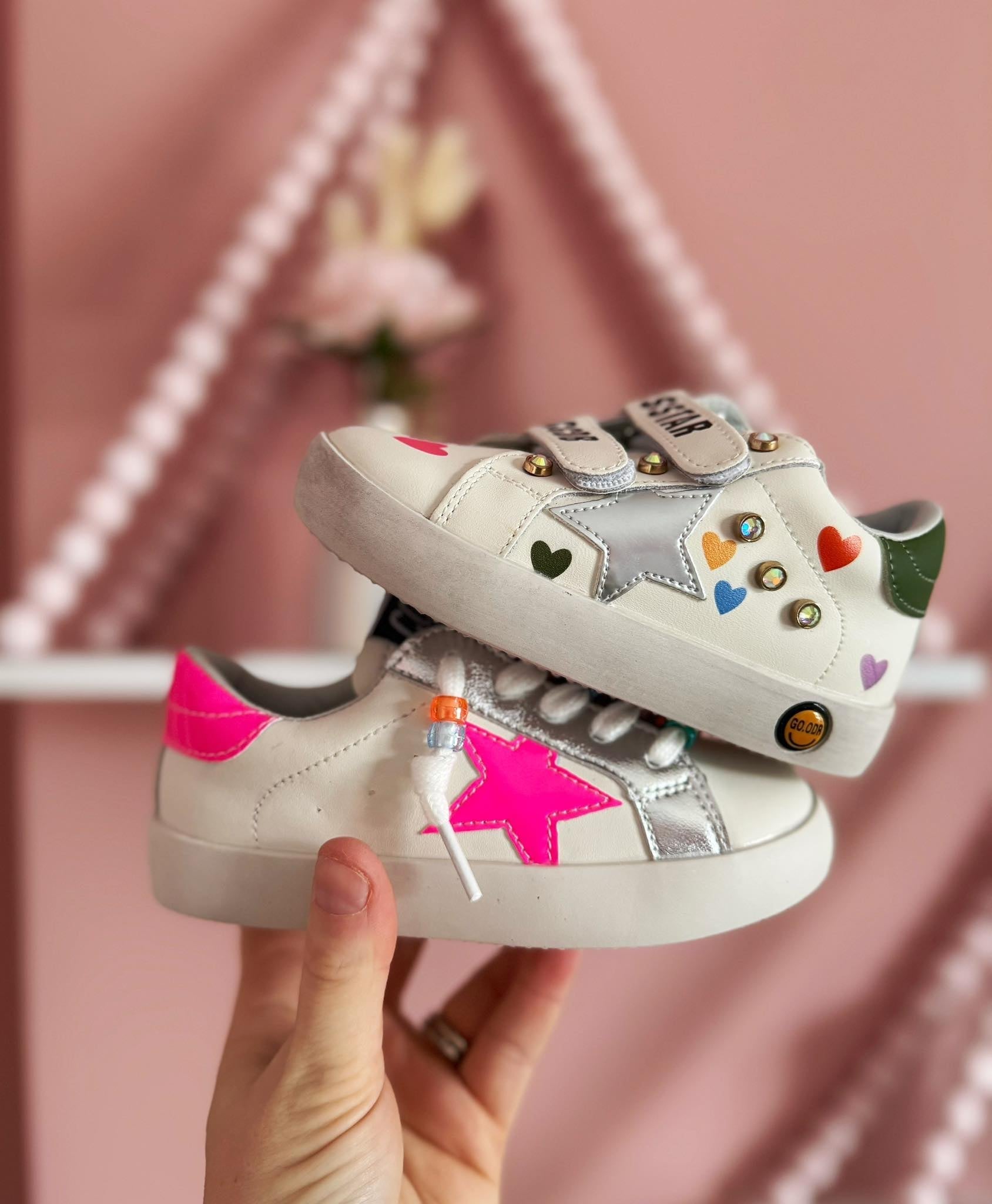 Step into sparkle and smiles with these vegan leather kids' tennis shoes! Choose your style: dazzling bling-covered kicks with oversized stars and hearts plus easy velcro closure, or hot pink star stunners adorned with beads and a cheerful smiley face on the shoelaces. Perfect for little rockstars who love to shine. Comfortable, cruelty-free, and totally fun.