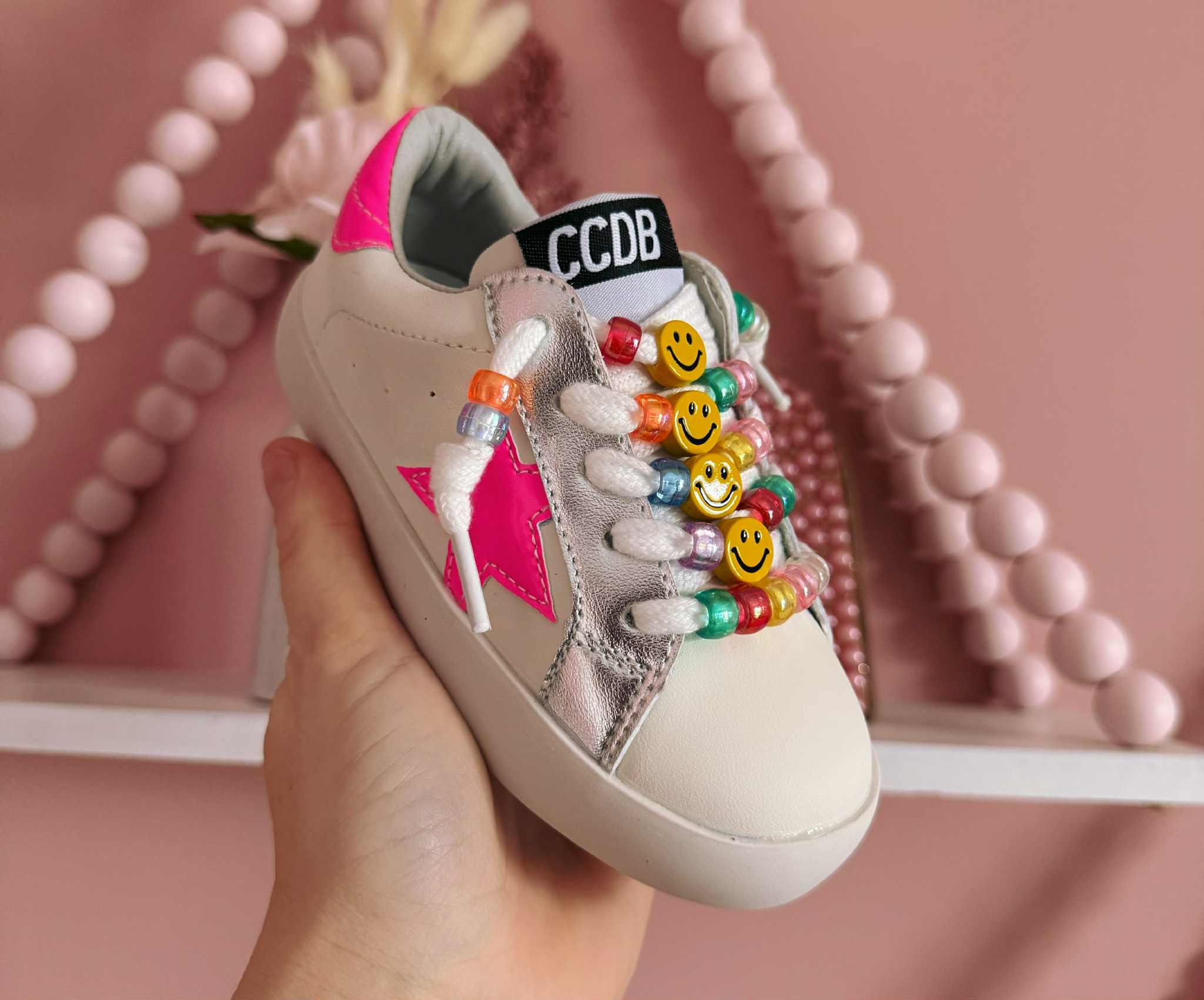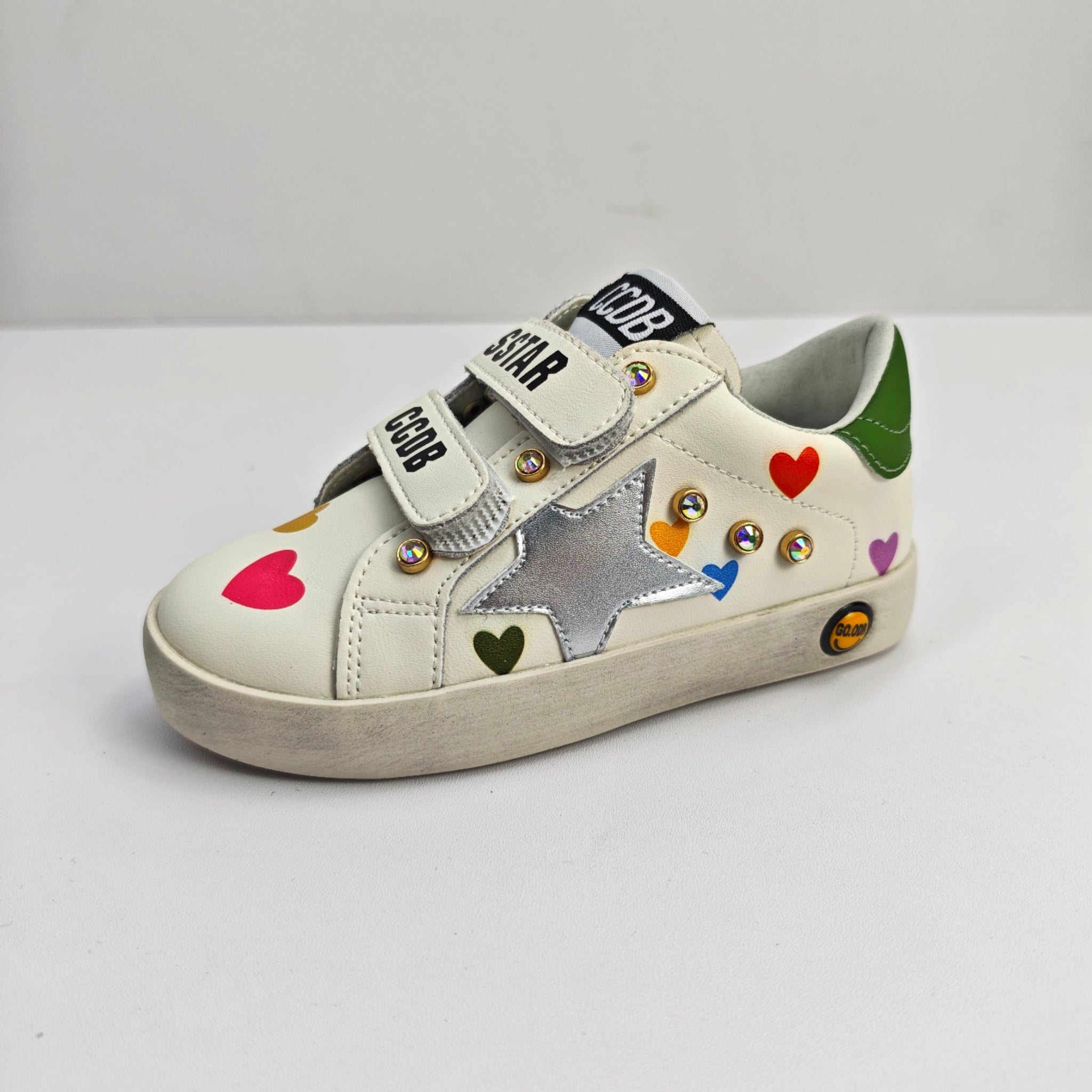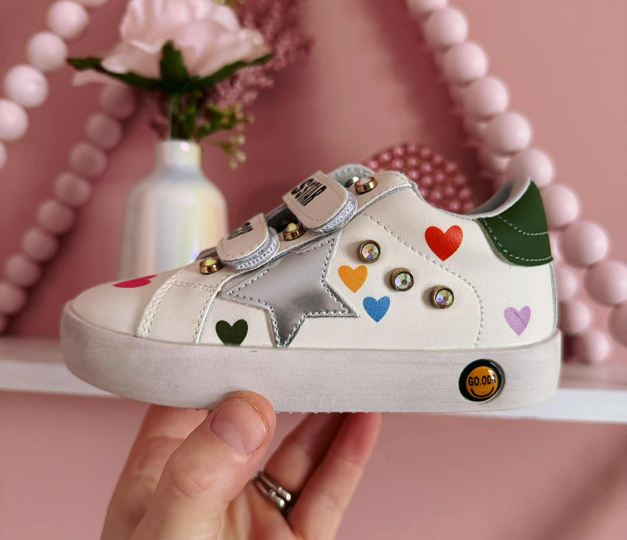 Step into sparkle and smiles with these vegan leather kids' tennis shoes! Choose your style: dazzling bling-covered kicks with oversized stars and hearts plus easy velcro closure, or hot pink star stunners adorned with beads and a cheerful smiley face on the shoelaces. Perfect for little rockstars who love to shine. Comfortable, cruelty-free, and totally fun.