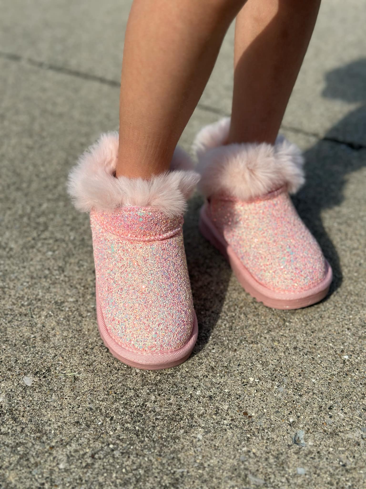 Introducing our Vegan Leather Fuzzy Sparkle Boot! The sparkly and fuzzy design adds a touch of glam, available in 3 colors for toddler sizes 6-12.